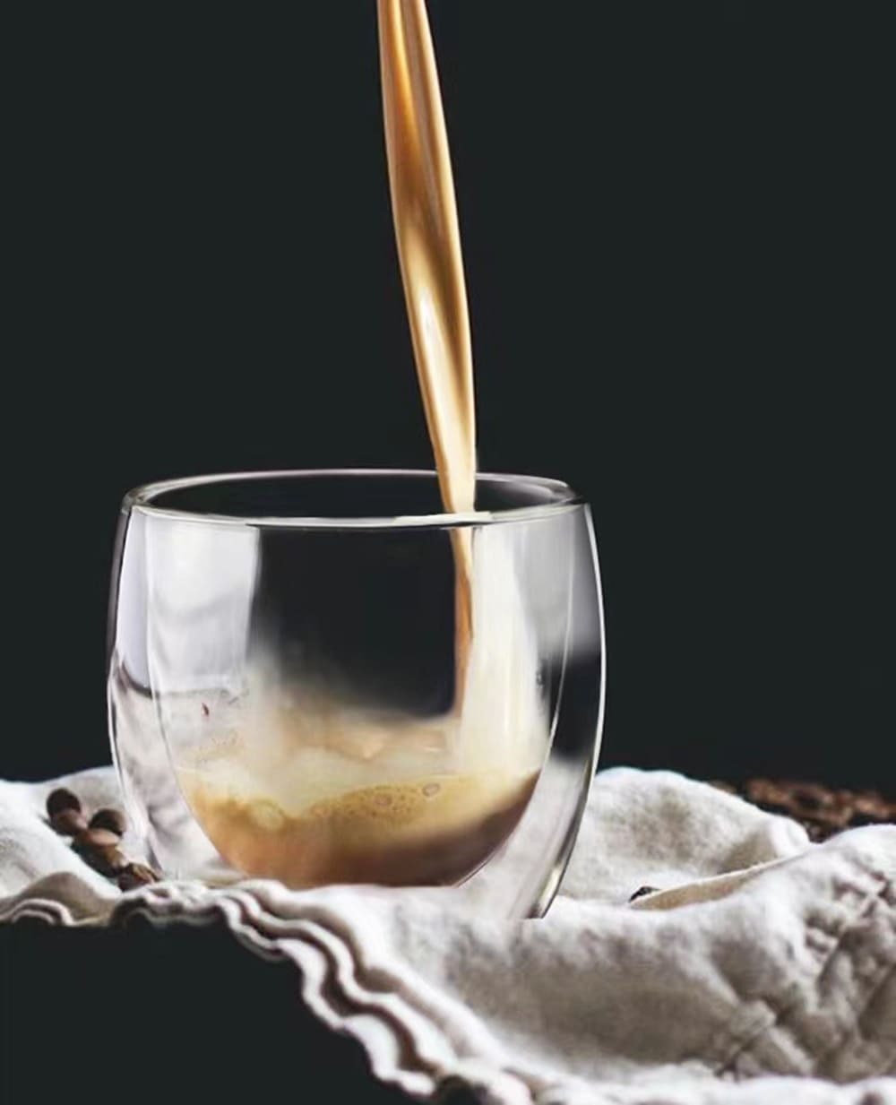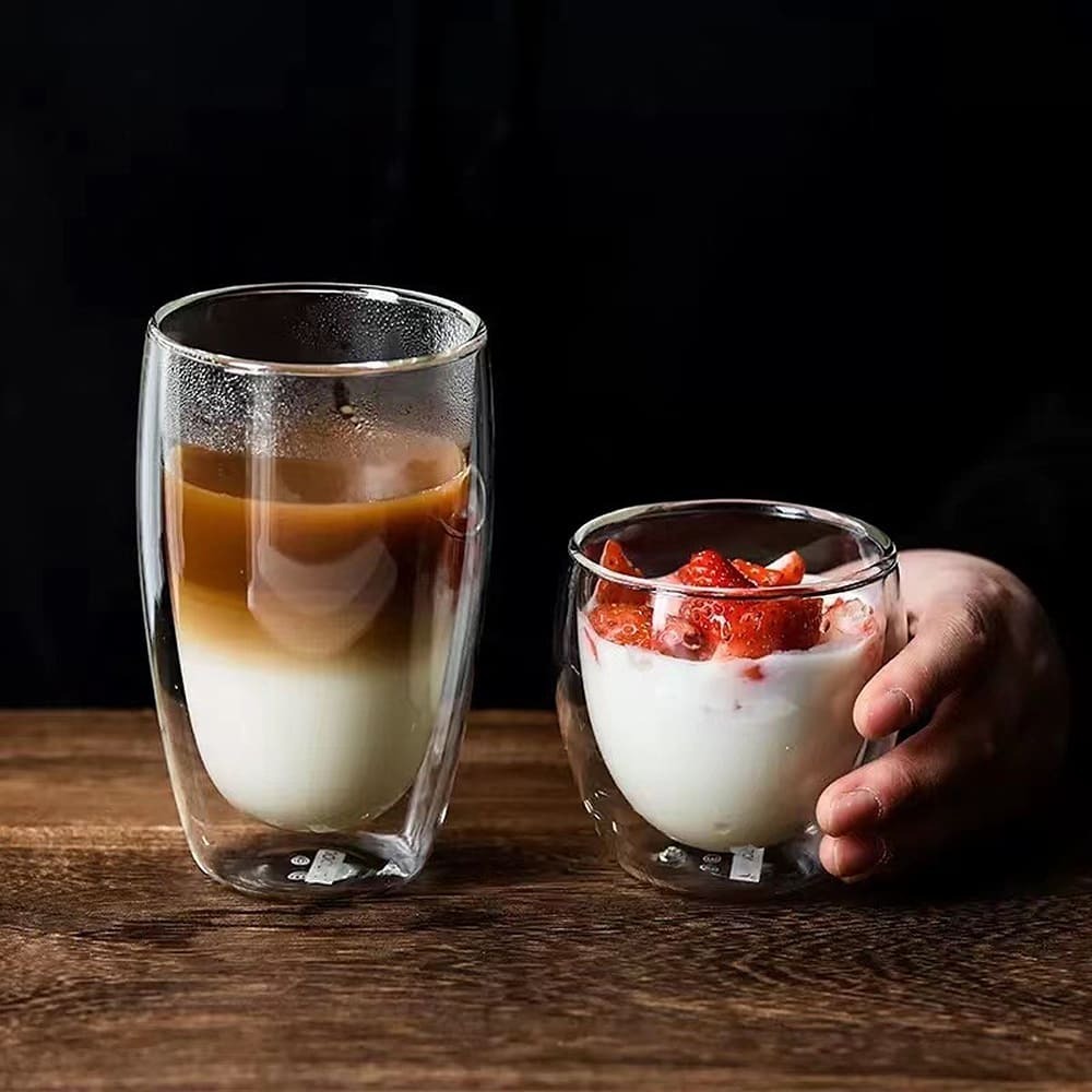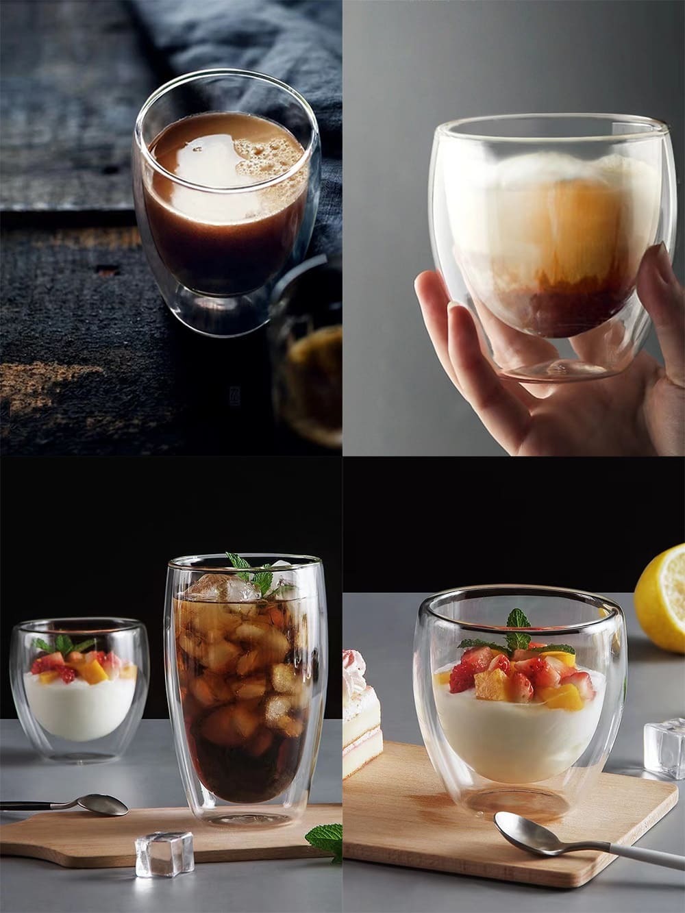 可盛裝熱飲或冷飲,此款玻璃杯具有隔熱與隔冷效果,裝熱茶或咖啡時不燙手,裝冰飲時玻璃杯外不會起水滴導致手滑。